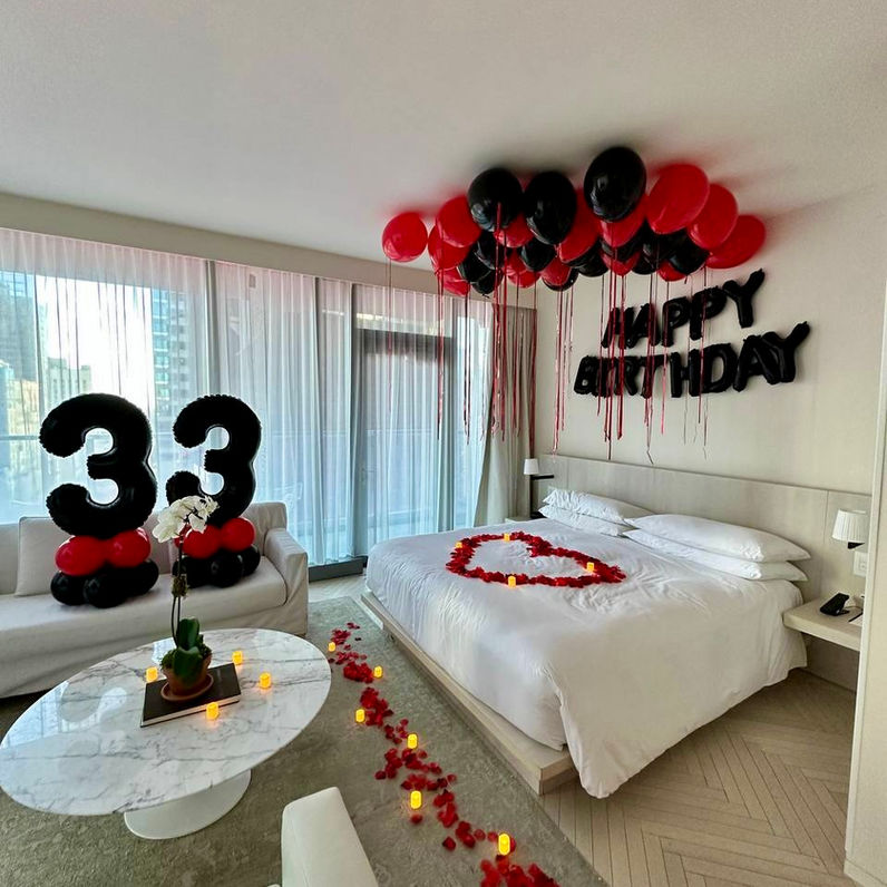 Classic room decoration with helium-filled balloons, rose petals, flower bouquets, LED candles, and more. We have different packages for every budget.